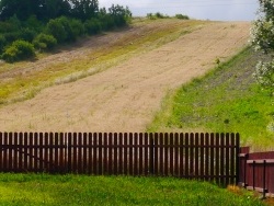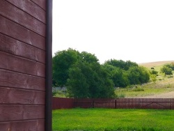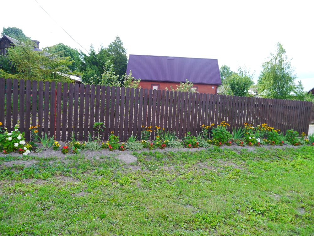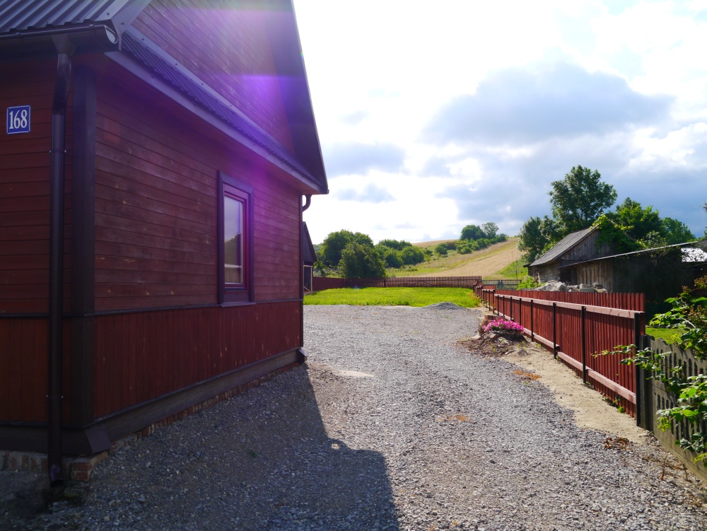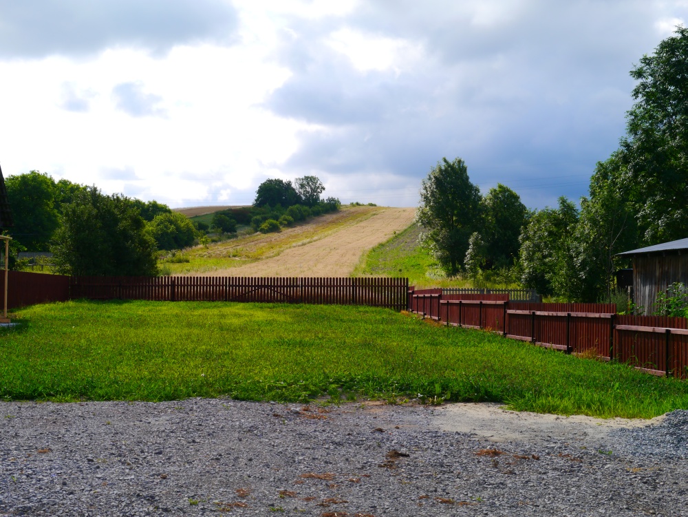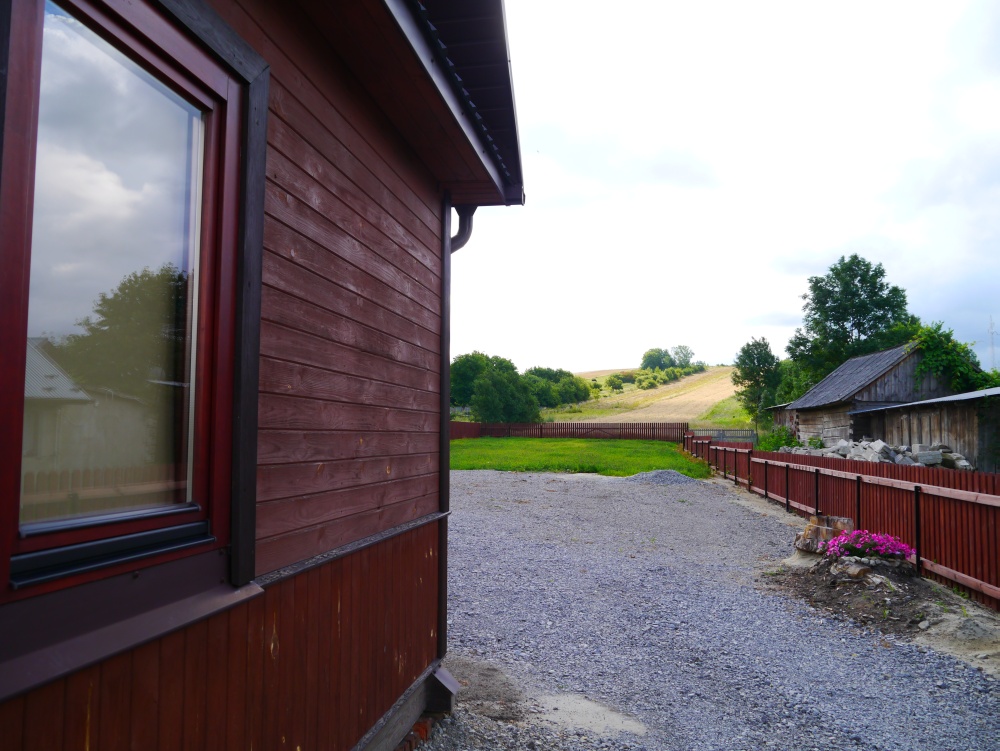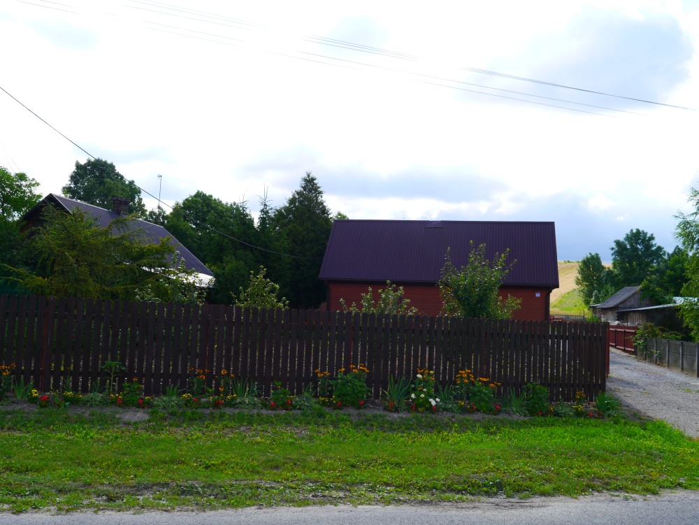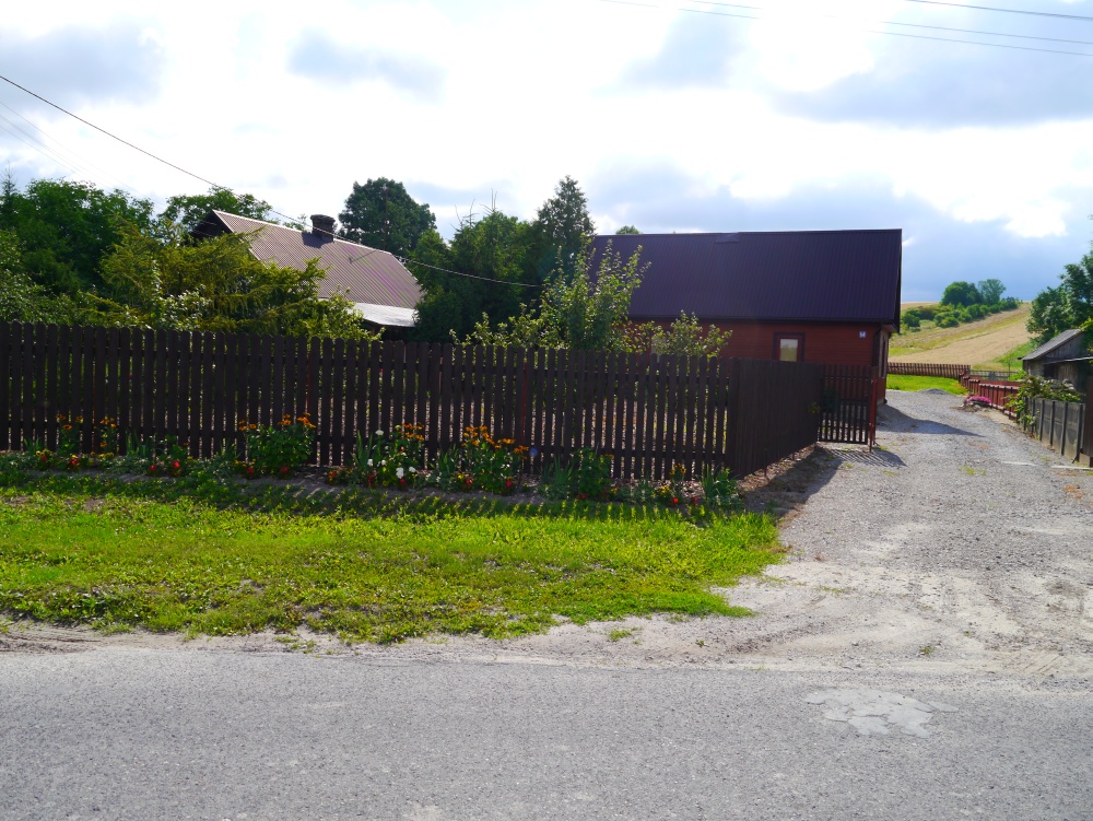 Domek jest ogrodzony ze wszystkich stron, na teren prowadzi od strony ulicy zamykana brama i furtka oraz zamykana brama od strony pól.