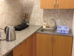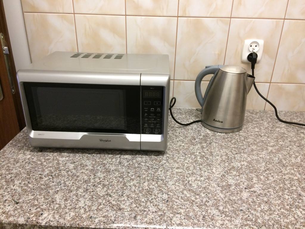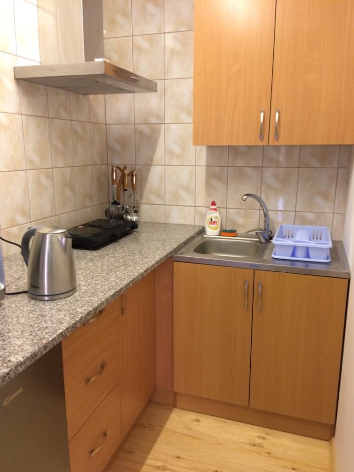 W domku do Waszej dyspozycji znajduje się kuchnia z wyposażeniem - patelnie, garnki, naczynia, sztućce, elektryczna dwupalnikowa ceramiczna płyta, kuchenka mikrofalowa, lodówka z zamrażalnikiem, zlew z ociekaczem, okap kuchenny i elektryczny czajnik. Zapraszamy również do korzystania z sezonowych dobrodziejstw naszego ogródka przy domku.